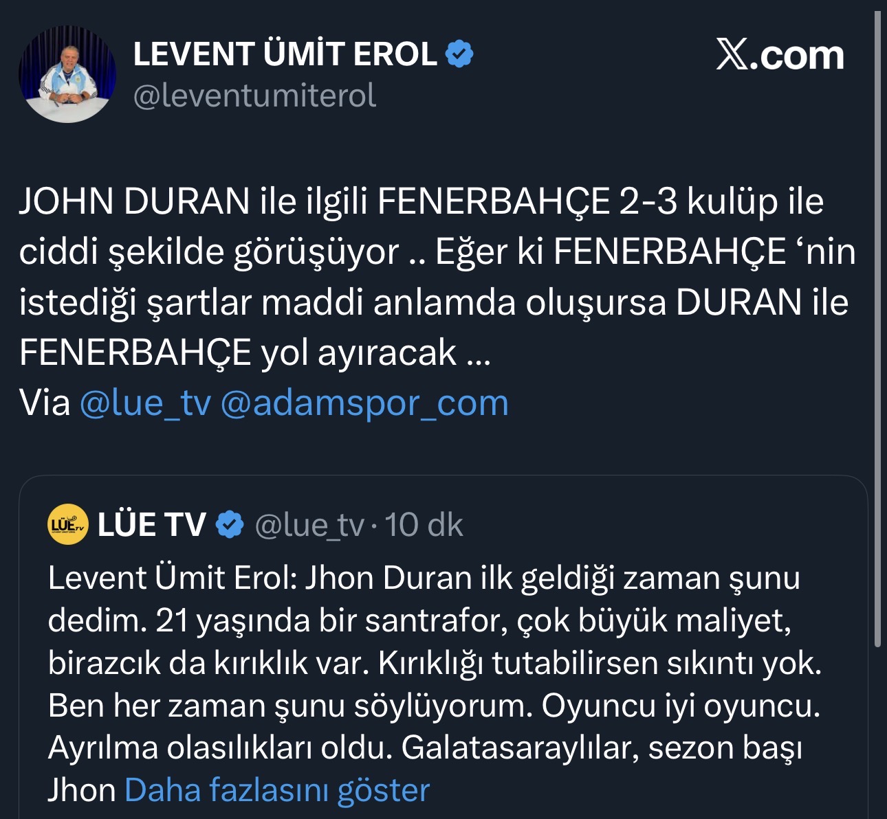 Eğer sarı-lacivertli kulübün belirlediği maddi şartlar ve beklentiler tam anlamıyla karşılanırsa, Fenerbahçe’nin John Duran ile yollarını ayırmasına kesin gözüyle bakılıyor. Haberin detaylarında, 21 yaşındaki golcünün yüksek maliyetine ve sahip olduğu “kırıklık” (istikrar/mizaç) faktörüne dikkat çeken Levent Ümit Erol, bu durumun doğru yönetilmesi halinde oyuncunun kalitesinden şüphe duyulmadığını ancak ayrılık olasılığının şu an masada olduğunu vurguladı. Geçmiş dönemlerde de takımdan ayrılması gündeme gelen Duran için yapılacak son pazarlıkların, oyuncunun kariyerindeki yeni rotayı belirlemesi bekleniyor.
