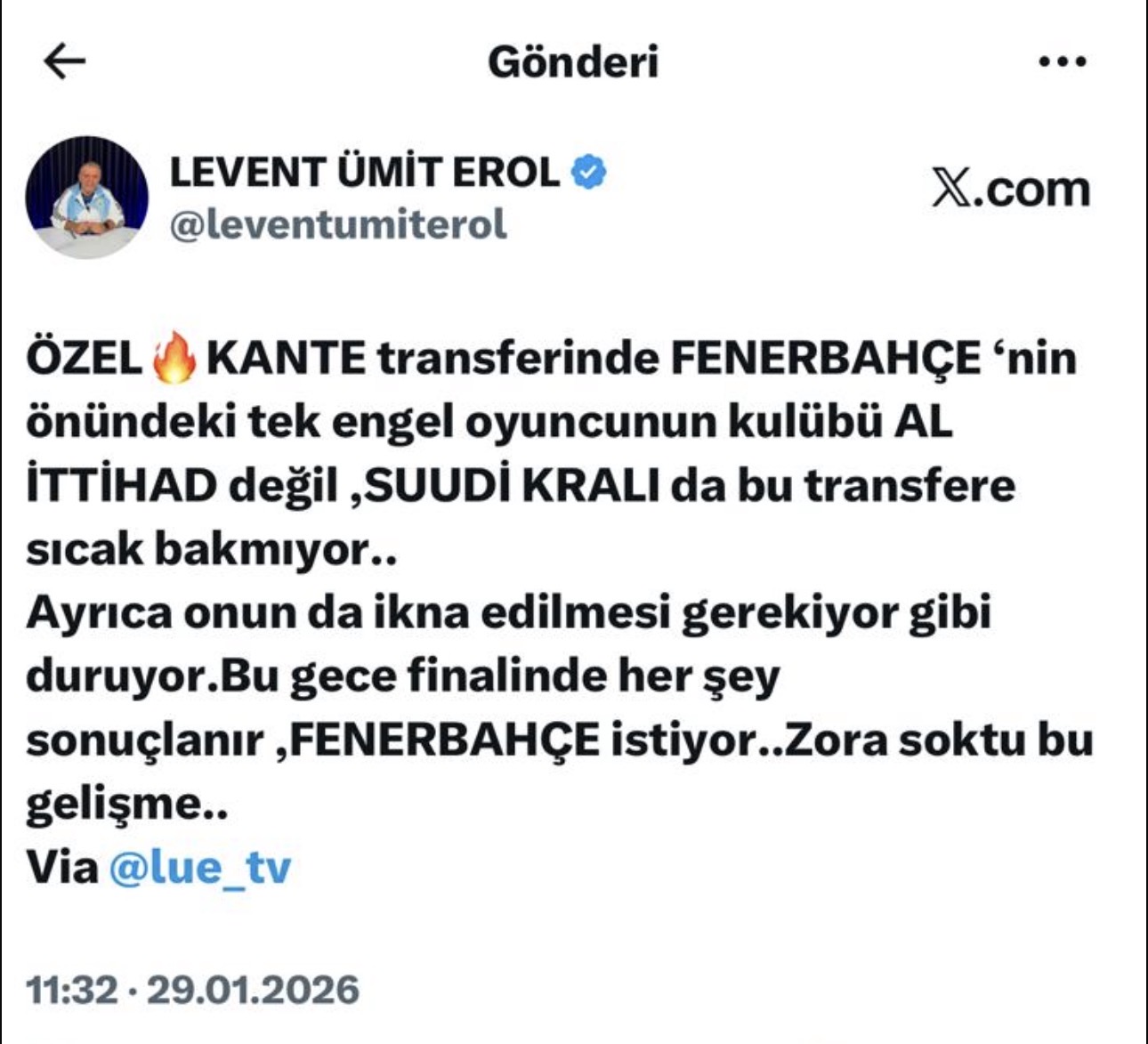 Kante’nin Suudi Arabistan futbol projesi için taşıdığı sembolik değer nedeniyle, transferin gerçekleşebilmesi için sadece kulüp yönetiminin değil, kraliyet makamının da ikna edilmesi gereken oldukça zorlu bir süreç işliyor. Fenerbahçe yönetiminin büyük bir kararlılıkla sürdürdüğü bu dev operasyonda, ikna turlarının sürdüğü ve her şeyin bu gece yarısı yapılacak son görüşmelerle netlik kazanacağı belirtiliyor. Levent Ümit Erol kaynaklı bilgilere göre, “zora giren” bu transfer hamlesinin akıbeti bu gece finalinde kesin olarak sonuçlanacak.